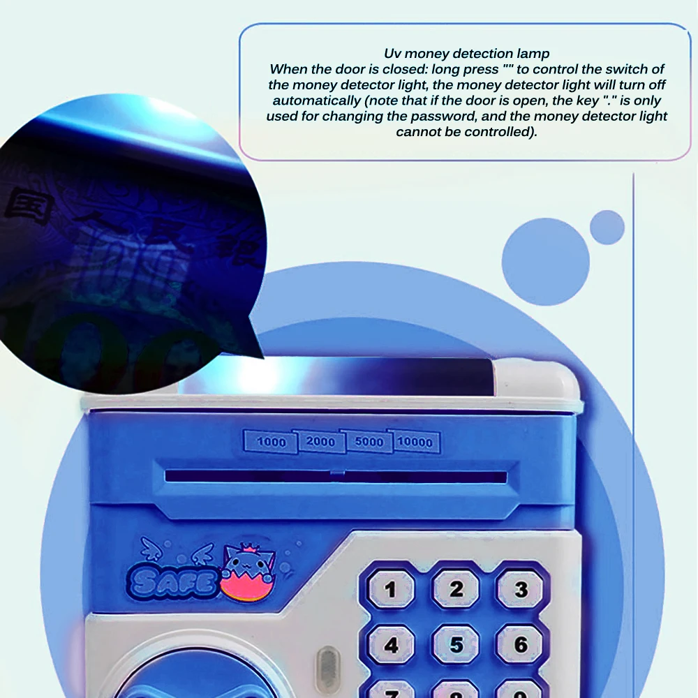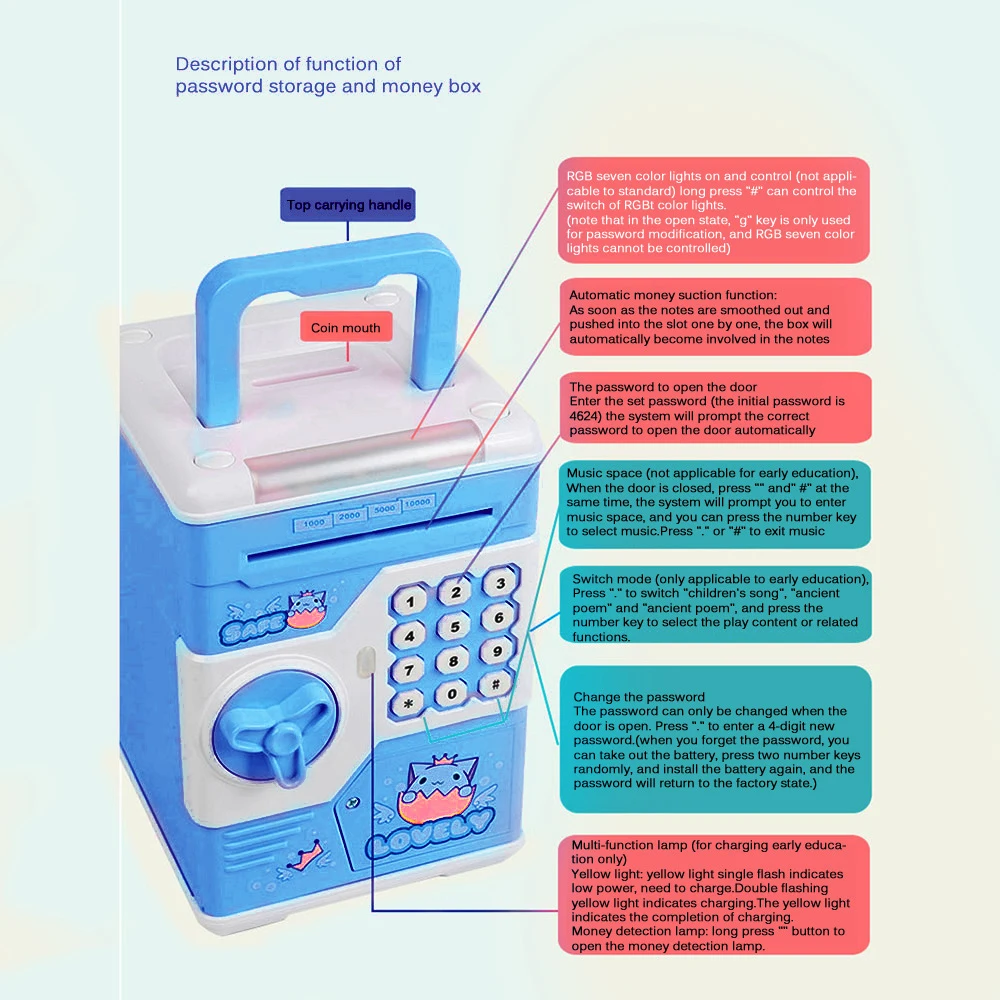 Эта электрическая Копилка питается от батареек АА 3*1,5 в (не входят в комплект), если она разряжена, вы не можете открыть дверцу коробки с паролем, который вы установили, он автоматически изменится на пароль по умолчанию, пожалуйста, не забудьте заменить батареи.