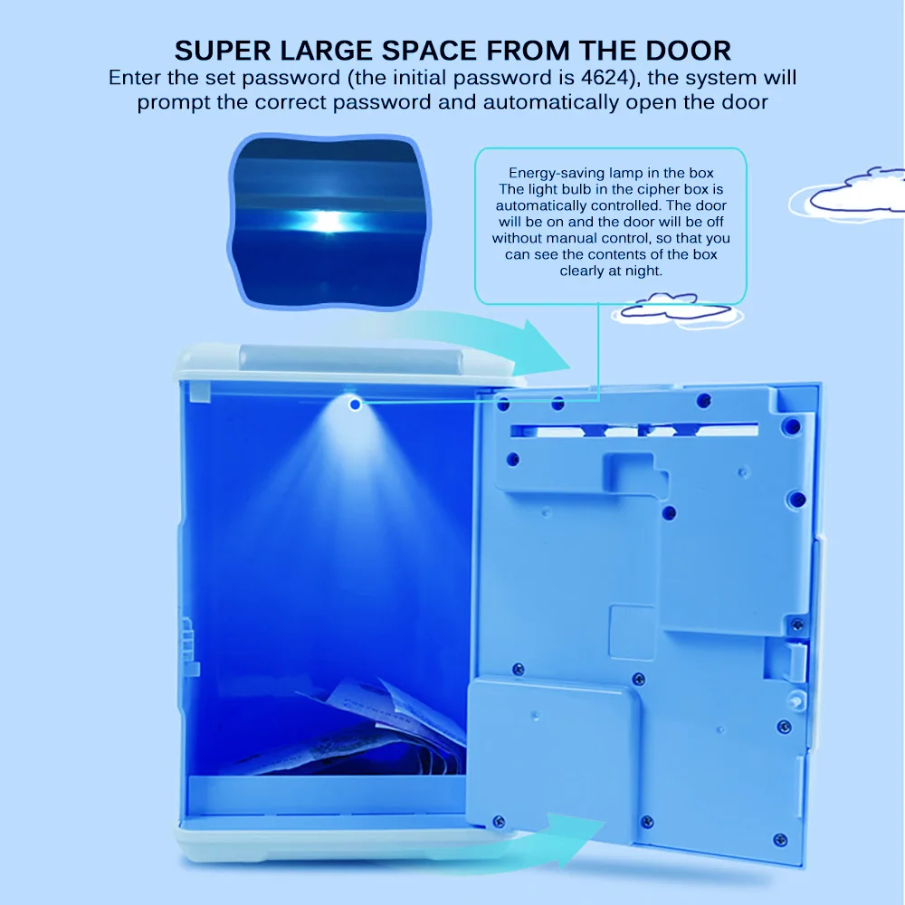 Конструкция с паролем может сделать ваши деньги более безопасными, при открытии дверцы коробки необходимо ввести 4 пароля,Пароль по умолчанию-4624, вы можете изменить на другой 4-значный пароль. Если вы забыли пароль, просто выньте аккумуляторы и перезапустите, пароль вернется к 4624.