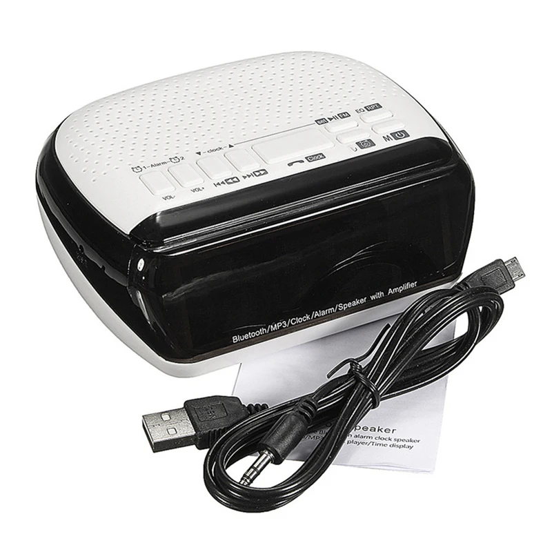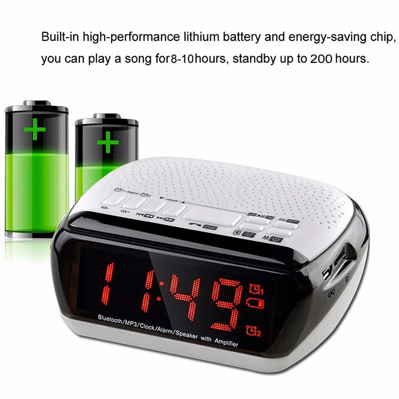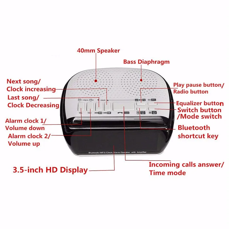 Особенность: 1. Поддержка bluetooth, функции FM 2. Звонки в режиме громкой связи Формат музыки: MP3,WAP,APE,WMA 3. Эффективный Цифровой Усилитель внутри 4. Высококачественный профессиональный гудок, профессиональный гудок широкого диапазона 5. Светодиодный экран 3,5 дюйма 6. Поддержка настройки двух сигналов тревоги, поддержка TF-карты (до 32 Гб, не входит в комплект) 7. Высококачественный стереозвук на 360 ° 9. Динамик s: Полнодиапазонный динамик 40 мм + пассивная вибропленка 9. Лучше всего подходит для портативных устройств с bluetooth, таких как IPAD, IPHONE и т. д. поддержка почти всех видов привычных сотовых телефонов Спецификация: 1. Рабочее расстояние: 10 метров 2. Выходная мощность: 3 Вт, 4 Ом 3. Источник питания: 5 В, 500 мА 4. Аккумулятор: литиевый аккумулятор 3,7 в, 1800 мАч 5. Время воспроизведения музыки: 8 часов 6. Использование часов: около 90 часов 7. Время в режиме ожидания: около 72 часов 8. Время зарядки: около 3 часов 9. Размер: см. Изображение