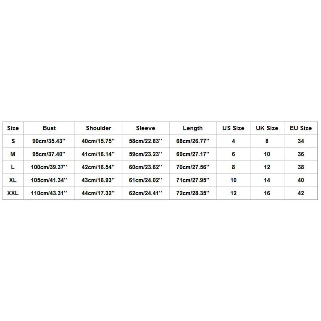 | Size | Bust | Shoulder | Sleeve | Length | US Size | UK Size | EU Size |