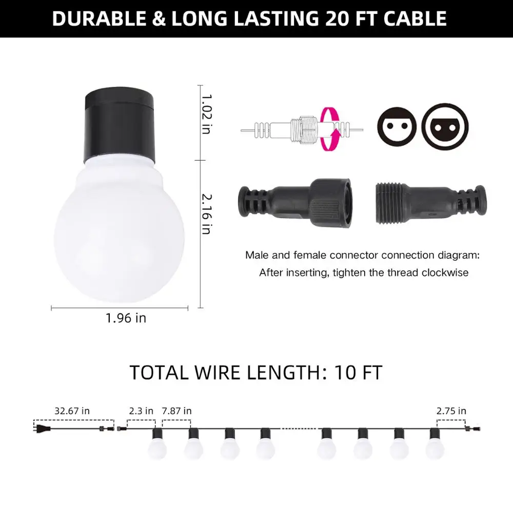 Цвет излучения: холодный белый/теплый белыйСветодиодный Кол-во: 20 шаровых лампВходное напряжение: 220 В переменного тока/ac110вШтепсельная Вилка: 110 В штепсельная вилка США/220 В штепсельная вилка европейского стандартаСтрунный светильник, общая длина с вилкой и источником питания: 6 мДиаметр шара: 1,96 дюймаЦвет провода: черный проводВерсия обложки: прозрачная лампа и матовая (молочная) лампаДанная модель ламп подключается, можно подключить максимум 15 шт. (максимум 100 м)Посылка в комплекте1 х один светильник с шаровым наконечником 20 светодиодов1x один провод с источником питания