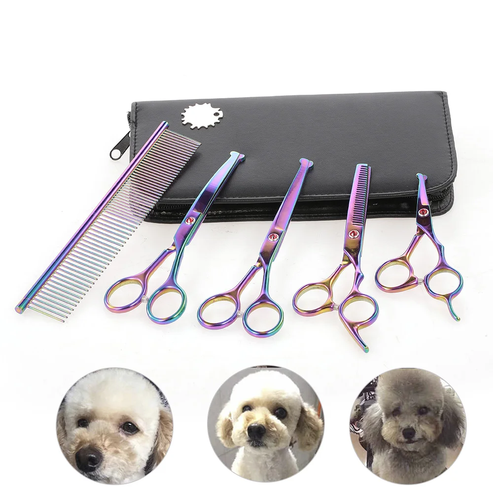 5 шт. ножницы для ухода за домашними животными из нержавеющей стали, набор для ухода за собаками, кошками, женихом, инструмент для волос, инструмент для ухода за домашними животными, триммер, прямые изогнутые филировочные ножницы