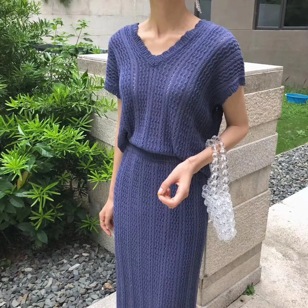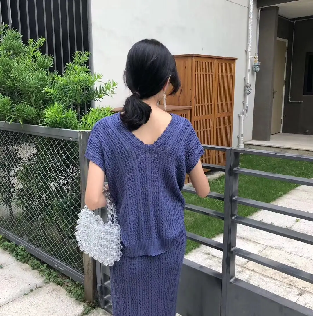 Тонкий скрученный костюм с юбкой, трикотажный комплект из 2 предметов, v-образный вырез, короткий рукав, Свободный Топ, облегающая длинная юбка, комплект, Женский комплект, новинка 2020, AQ829