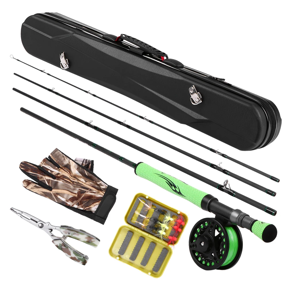 Полная посылка: это полная рыболовная посылка, которая включает в себя 4-секционную удочку из углеродного волокна, рыболовную удочку с леской, пару рыболовных перчаток, плоскогубцы, летучая коробка с 12 мушками и роскошный чехол для переноски.