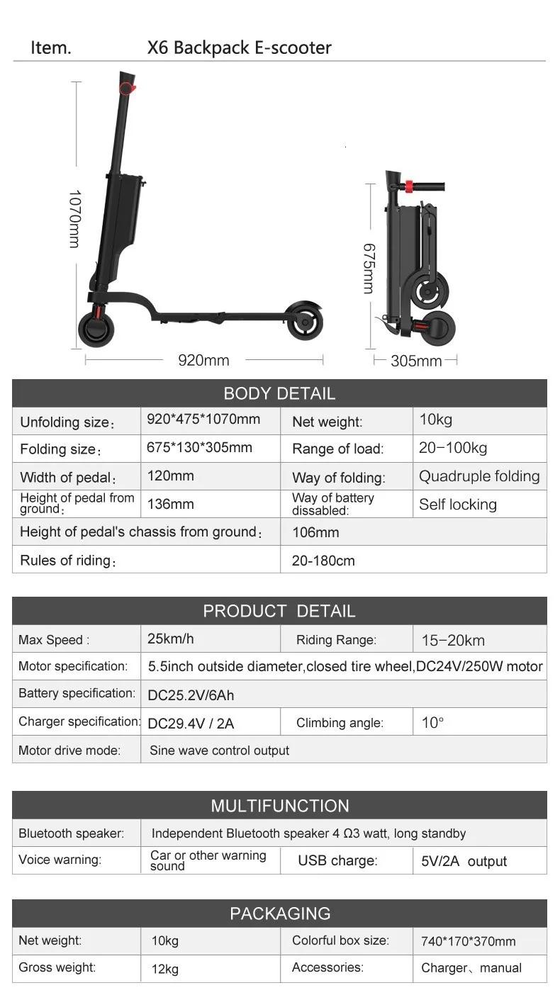 | Размер складывания: Д * Ш * В = 620*120*259 мм, | Разворачивающийся Размер: Д * Ш * В = 926*410*1012 мм | Максимальная скорость: 25 км/ч | Максимальный диапазон: 20 км |