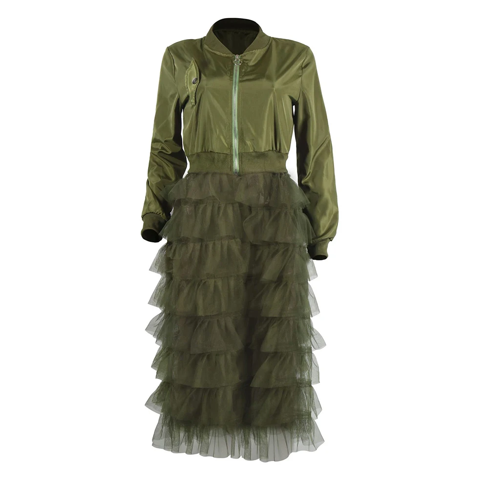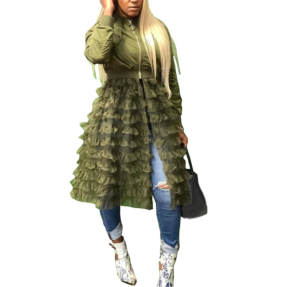 Модная женская осенняя куртка на молнии с длинным рукавом, кружевное Сетчатое платье миди-пальто
