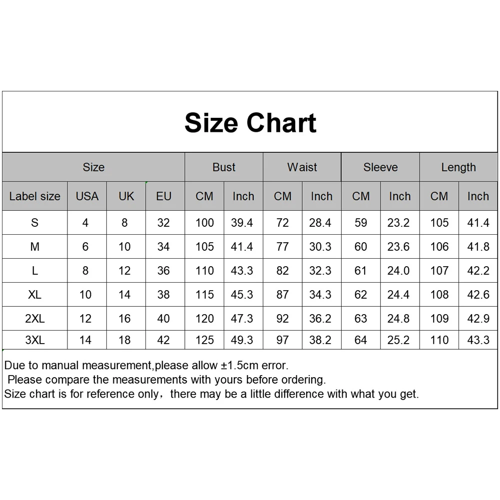 [Наш Размер XL] Бюст: 115 см/45,3 дюйма, Талия: 87 см/34,3 дюйма, рукав: 62 см/24,4 дюйма, длина: 108 см/42,6 дюйма (прибл.)