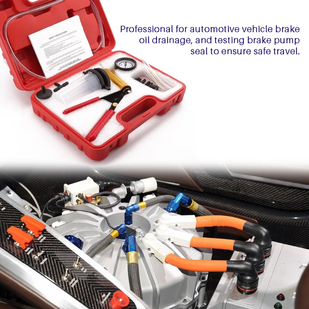 1 * Вакуумный насос с манометром4 * вакуумный шланг2 * крышки3 * тормозной Bleeder винт адаптер2 * адаптер конического шланга1 * прямой разъем1 * т соединитель шланга1 * резервуар тормозной жидкости1 * Универсальный адаптер для чашки1 * Пластиковый Чехол