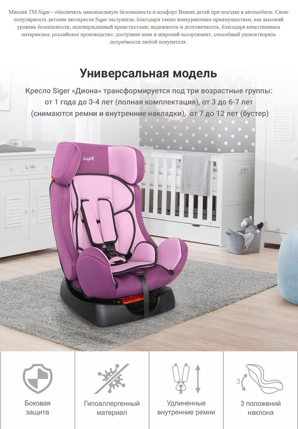 Отзывы о Siger "Диона" Детское автокресло на возраст 0-7 лет от 0 до 25 кг группа +/1/2