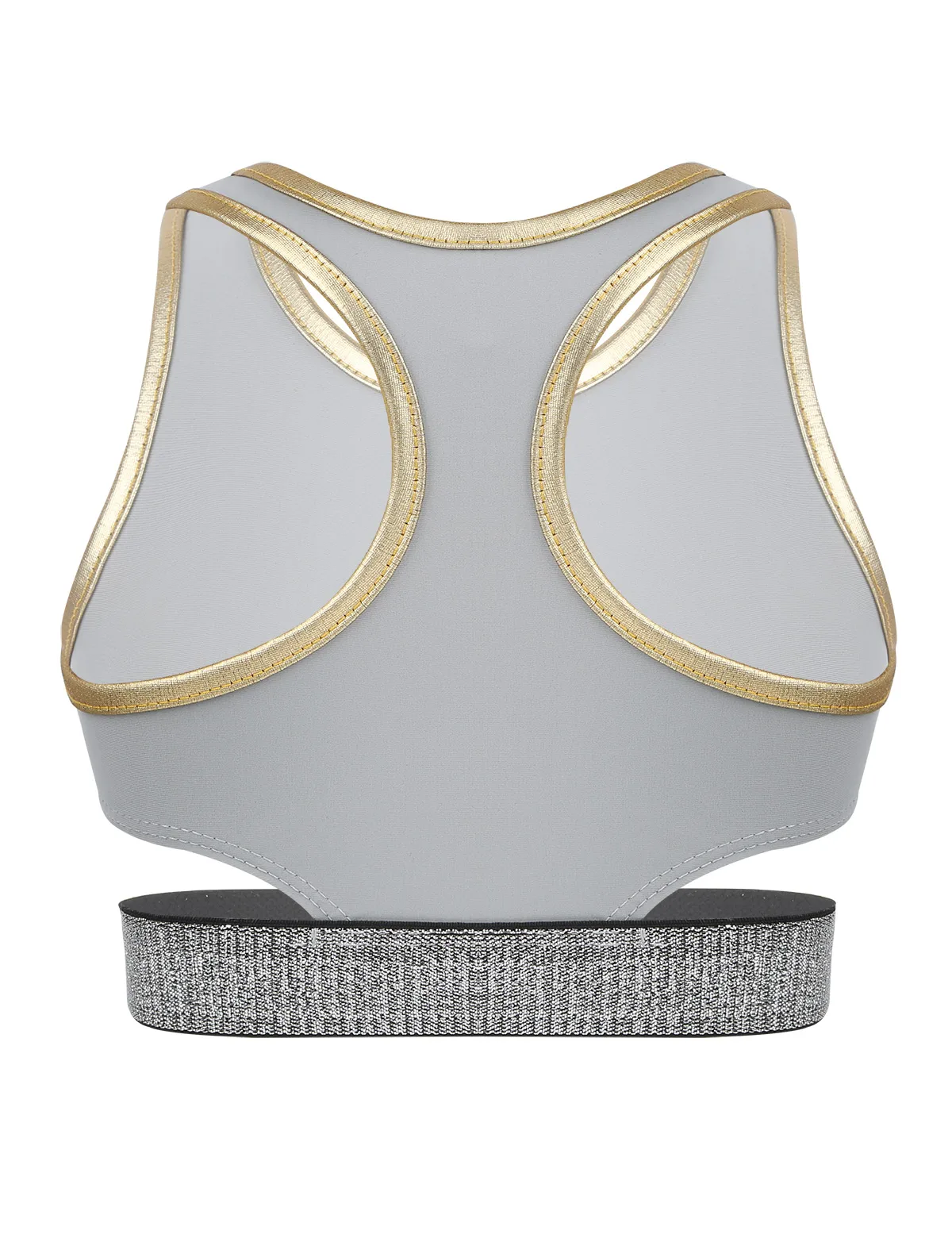 Без рукавов, с круглым вырезом. Борцовка. Вырезы с двух сторон. Блестящий эластичный подол помогает надежно держать верх на месте. Застежка на липучке.