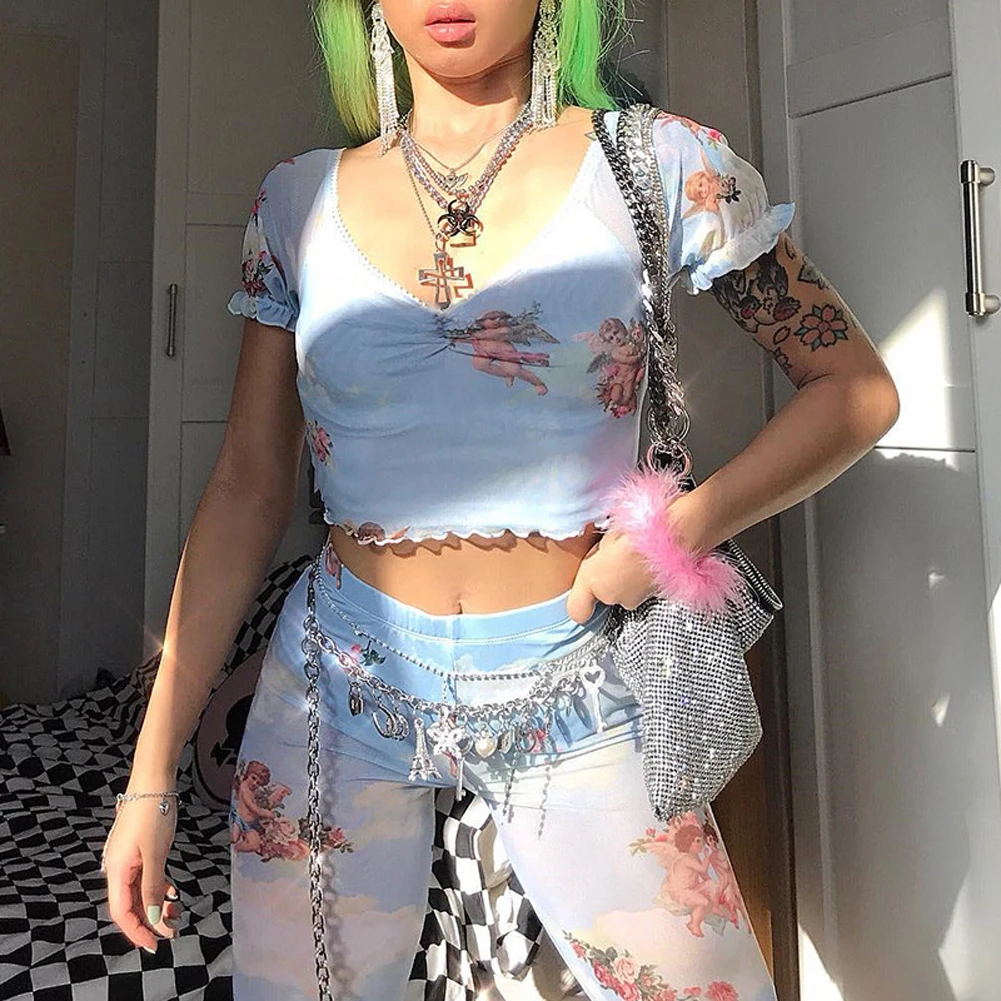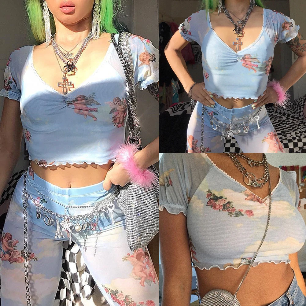 Отзывы о Женский короткий топ с принтом ангела винтажный сетчатый коротким рукавом лето