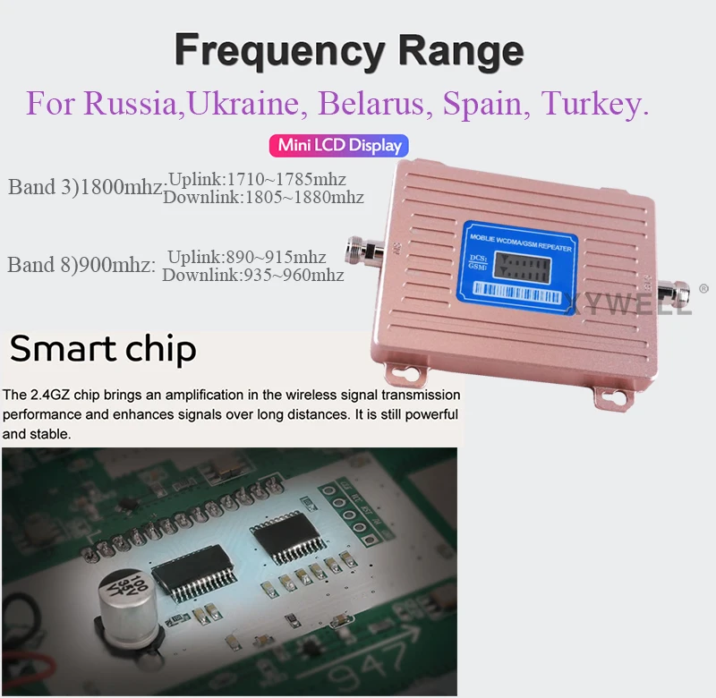 Этот усилитель подходит для GSM 900 МГц DCS1800mhz частотного диапазона. Он может увеличить 2G 3G голосовые данные 4G. Если ваш сигнал 4G LTE 1800 (FDD band 3), этот повторитель также может увеличить данные 4g для вас. Пожалуйста, убедитесь, что вы можете получить как минимум 2 бар 900 МГц (полоса 8)1800 МГц (полоса 3) сигнал на открытом воздухе перед покупкой, в противном случае этот продукт не может вам помочь. Для улучшения сигнала в помещении необходим хороший внешний сигнал.