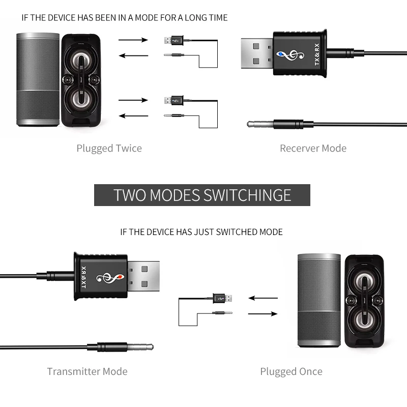 Режим TX: режим TX будет автоматически поиск других приемных устройств Bluetooth (таких как bluetooth-гарнитура, bluetooth-динамик, bluetooth-приемник и т. д.), Красный светильник мигает во время сопряжения, И Красный светильник перестанет мигать после завершения сопряжения. Подключите продукт к устройству, например телевизору, с помощью аудиокабеля 3,5/аудиокабеля RCA.
