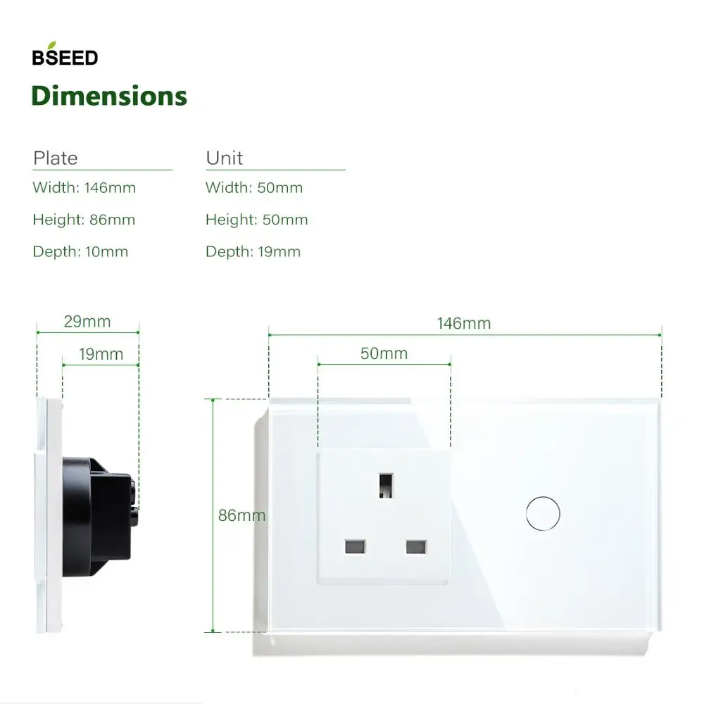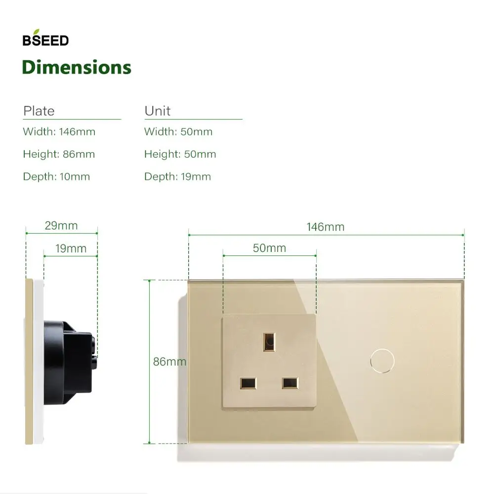1. Супер чувствительность-просто нужно слегка прикоснуться к нему. 2. Модный стиль 1 кнопочный переключатель 1/2 + британская розетка. 3. Доступны популярные цвета: черный, белый, золотистый. 4. Кнопка будет светиться ночью, что облегчит поиск. 5. Водонепроницаемость и устойчивость к царапинам. Защита от поражения электрическим током. 6. Различные тестирования качества во время производства, чтобы гарантировать, что каждый переключатель хорошо работает до его доставки клиентам. 7. Элегантный вид, отлично подходит ко многим современным стилям декора. Может применяться для гостиной, спальни, коридора, кухни, ванной комнаты, офиса и так далее. Описание продукта: Название бренда:BSEED Размер: 146X 86X 35 мм Цвета:Черный, белый, золотой Ток:16А Материал:Сплав + Хрустальное стекло Гарантия:1 год Тип переключателя:Сенсорный Переключатель ВКЛ/ВЫКЛ Механический срок службы:100000 раз Рабочее напряжение:110-240 в пер. тока Относительная влажность:10% ~ 93% Потребление энергии:0,02 Вт Рабочая температура:-20 ℃ ~ + 70 ℃ Примечание: Вам придется отключить питание и во время установки