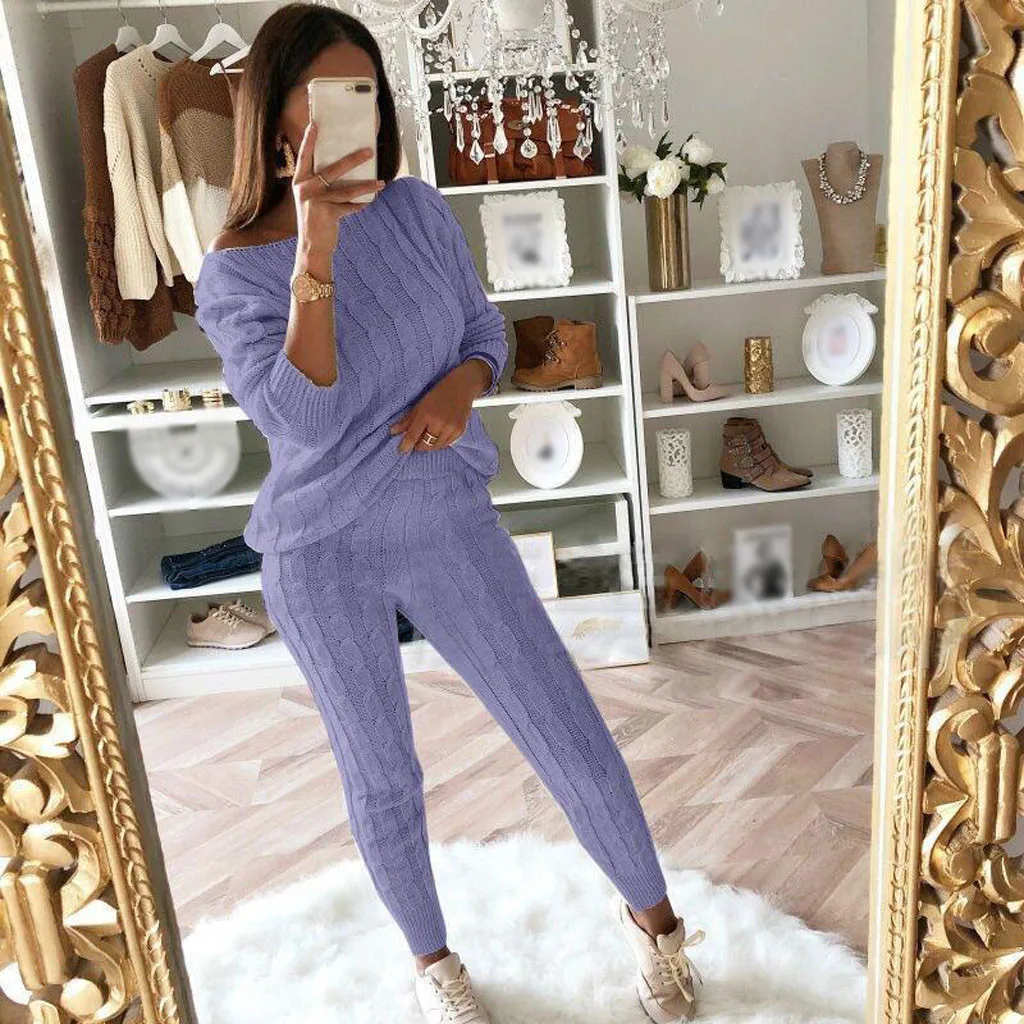 Женская обувь Женский однотонный вязаный теплый костюм из 2 предметов, с круглым вырезом, для дома