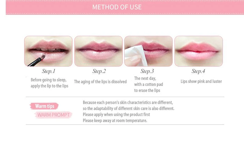 Способ использования в день: 1: Очистите губы водой перед макияжем 2: Возьмите маску для губ и протрите ее на губах 3: сделайте массаж для губ около 10 секунд, а затем макияж глаз и т. Д. 4: протрите дополнительную маску для губ перед макияжем губ 5: теперь ваши губы увлажняют и питают, вы можете использовать помаду. Способ использования в ночное время: 1: средство для удаления макияжа губ и очистки водой. 2: нанесите маску для губ на губы перед сном. 3: Хорошего вечера. В комплект входит: 1 маска для губ