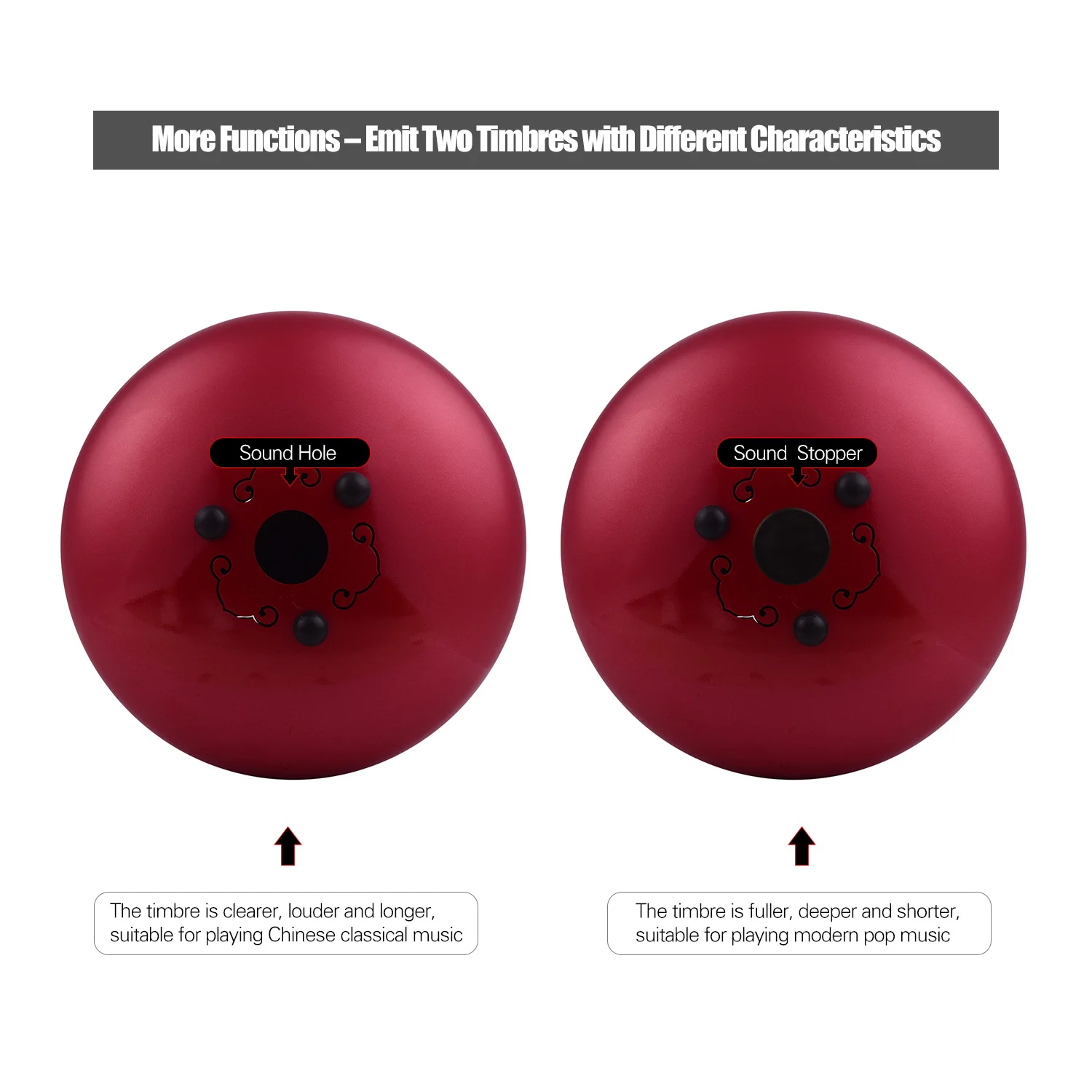 Со звуковой пробкой на спине, со скрытой фиксацией: изменение тембра стального барабана Tougue. Когда установлена звуковая пробка, тембр полнее и глубже, поддерживающий тон короткий, подходит для воспроизведения современной поп-музыки; Так как звуковая пробка разбирается, тембр становится четче, громче и дольше, подходит для воспроизведения классической китайской музыки.