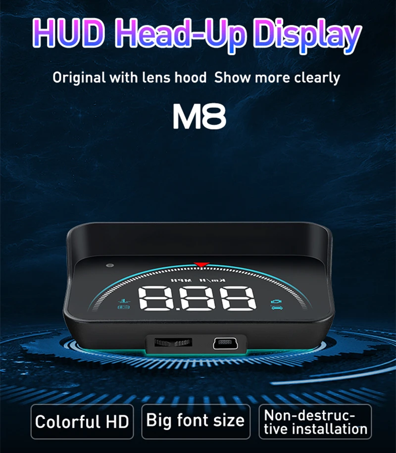 Что такое HUD M8? Благодарим Вас за покупку нашего HUD M8 этот продукт предназначен для безопасности водителей, особенно при высокоскоростном вождении в ночное время, HUD может держать водителя глаза на дороге и может уменьшить автомобильную аварию. HUD может проецировать важную информацию (например, скорость) на лобовое стекло, это может помочь неопытным новичкам контролировать свою скорость и избежать превышения скорости на скорости. Это позволяет водителю мгновенно считывать количество в большом видении и всегда делать водители глаза на дороге в ясном уме. Голова вверх дисплей М8 в основном Feactures 1. Доступно для автомобилей с OBD2 и EUOBD портом (автомобильная автоматическая диагностическая система), подключи и работай 2. TFT lcd многоцветный умный дисплей 3. Первое сканирование покажет протокол транспортного средства 4. Многофункциональный режим отображения или простой режим отображения можно переключать свободно 5. Добавить новые функции: ускорение конкурентного режима, тест производительности тормоза, может считывать всю информацию о потоке данных автомобиля 6. Богатое содержание: скорость транспортного средства, обороты двигателя, температура воды, напряжение, мгновенное, одно расстояние вождения. 7. Информация о тревоге: Сигнализация низкого напряжения, сигнализация высокой температуры воды, сигнализация о превышении скорости, сигнализация о коде неисправности двигателя.
