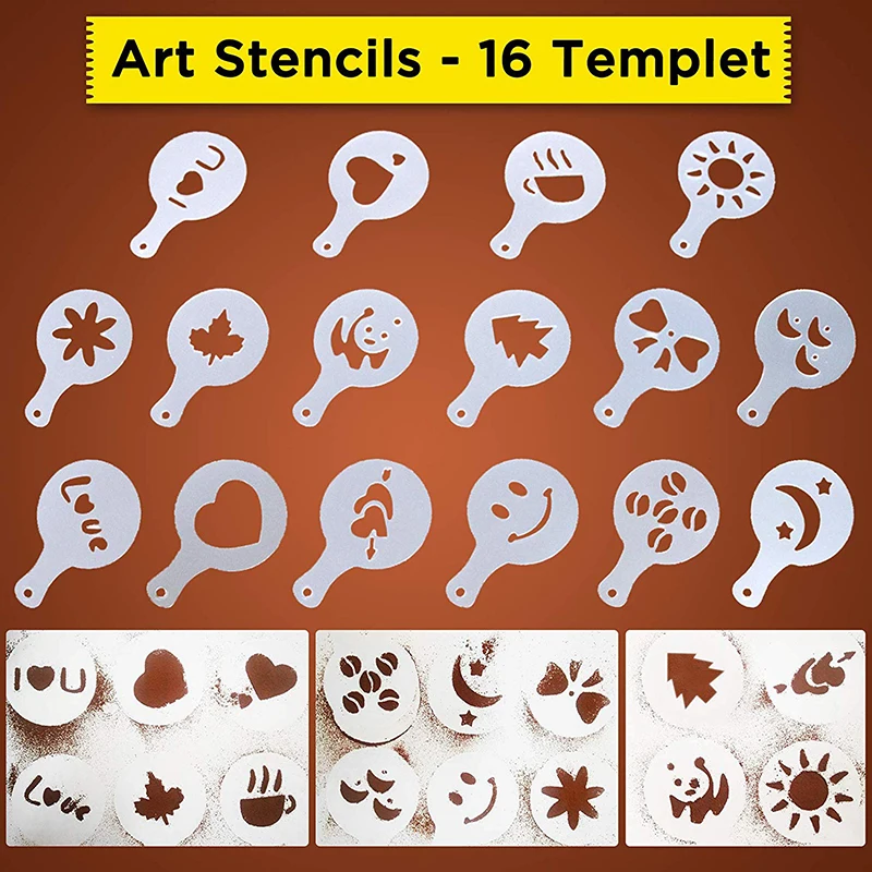 16 шт. трафаретов различных видов узоров, удовлетворяют все ваши потребности и предпочтения. Они являются профессиональными художественными трафаретами для создания красивых узоров для латте, капучино, овсянки для детей, Кекс, торт, горячий шоколад или любые другие вещи, которые вы хотите.