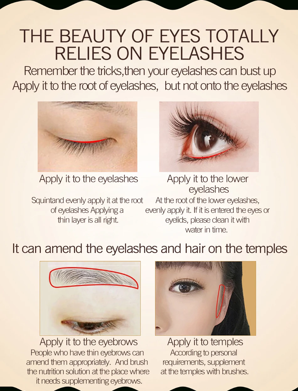 [Инструкция]: Наносите корни верхних и нижних ресниц каждое утро и вечером и наносите на некоторые участки длинных ресниц. Не наносите волосы без длинных волос и не отражайте тонкие волосы.