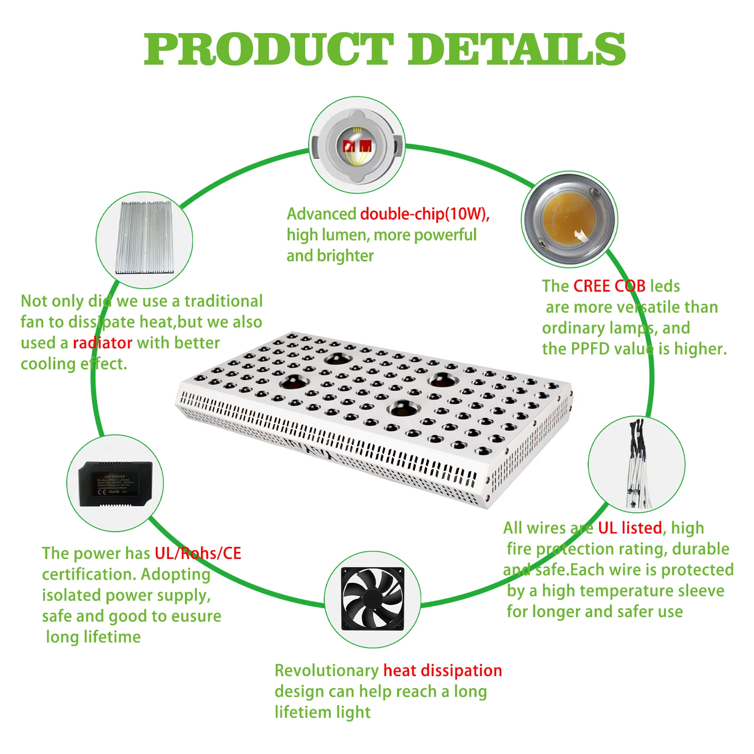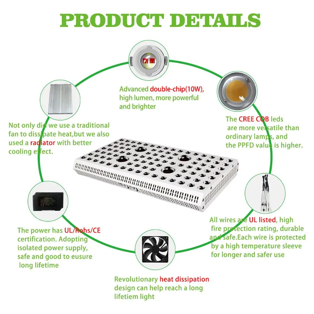 Светодиоды CREE COB-CREE COB известны высокой мощностью и стабильностью. CREE COB, более высокая яркость, меньшее тепловое сопротивление, меньшее затухание светильник и более длительный срок службы. CREE COB сам по себе-это конструкция полного спектра с высоким значением PPFD, которая может способствовать более быстрому и качественному росту растений