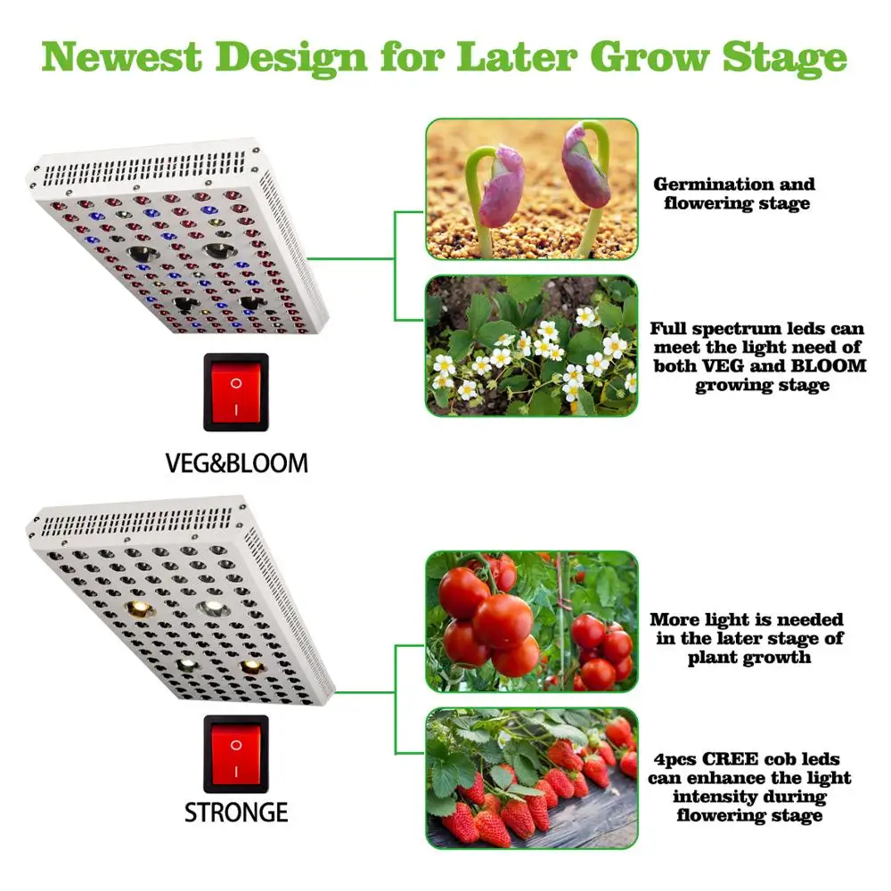 Конструкция с двумя переключателями: светодиодный светильник мощностью 2000 Вт с переключателем VEG & BLOOM, а более сильная Настройка переключателя позволяет включать/выключать в любое время на разных стадиях роста. Модель VEG & BLOOM может обеспечить полный спектр светильник для ваших растений на этапе veg и flower. В сочетании с нашими изначально разработанными светодиодами 3000K и 6000K COB, более сильная модель может обеспечить полный спектр (нм-780 нм) С гораздо более высоким PPFD и люменом, чем другие обычные светсветильник льники для ваших растений на этапах цветов и фруктов.