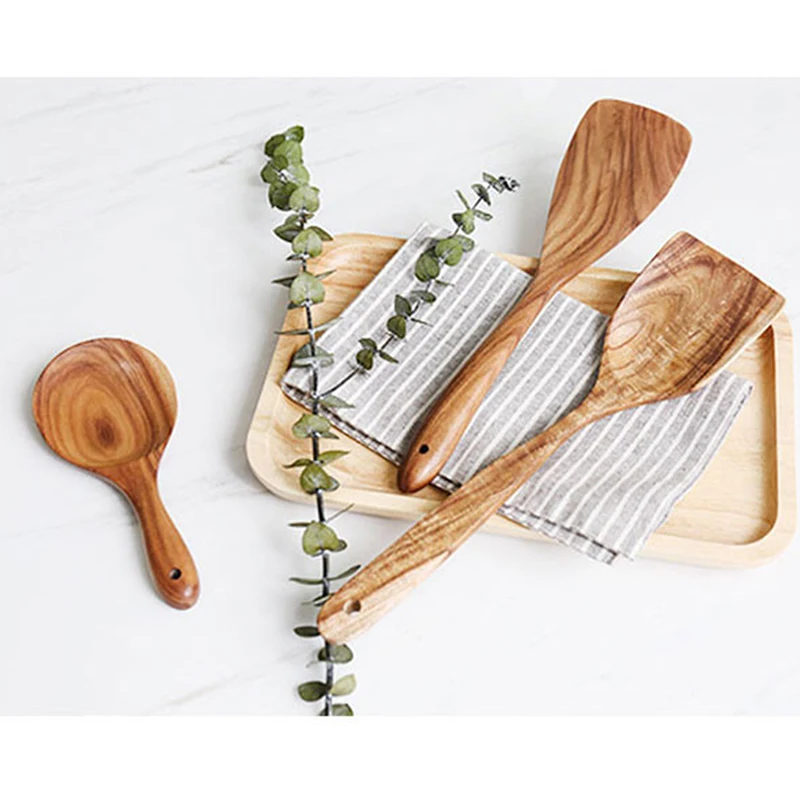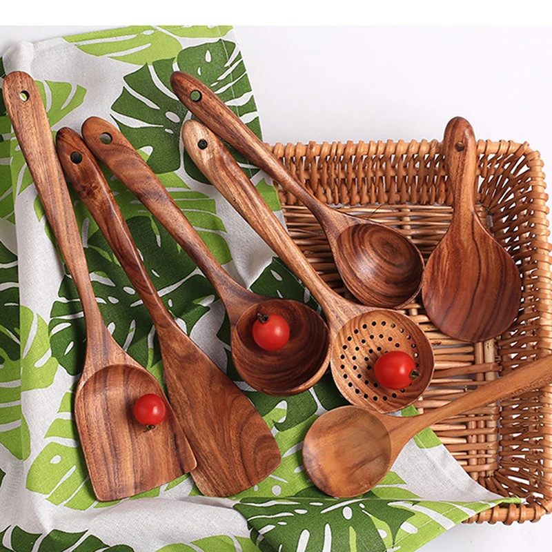 7 видов, высокое качество, деревянная лопатка из тайского тика, лопатка с рисовой ложкой, большой совок для супа, для приготовления пищи, деревянные кухонные принадлежности