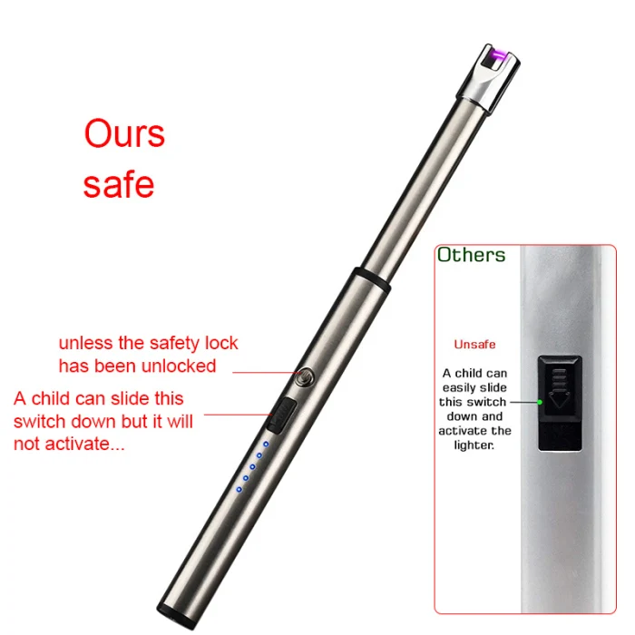 1. Двойной защитный замок особенность:В два раза безопаснее всех других зажигалок на рынке. Другие зажигалки имеют слабую систему безопасности, которая может легко использоваться детьми. У нас есть очень безопасный двойной замок безопасности, чтобы дети не могли случайно включить его.