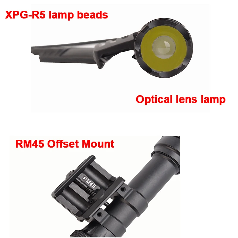 -CREE XLamp XP G2-R5 LED generates 350 lumens of blinding white light. -RM45 mount positions the light in the offset position between the rails of a MIL-STD-1913 (Picatinny) forend, decreasing overall weapon profile and limiting potential snag factor -DS07 switch assembly comes with two different operation methods: Click ON/OFF pushbutton Switch Plug-In Remote Tape Switch -Powered by 2*CR123A(3.0V) or 2*16340(3.7V) Batteries. -Color: BLACK