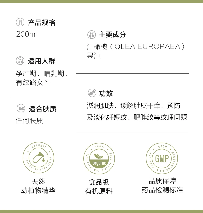 Руководство по эксплуатации: * Натуральное органическое сырье в сочетании с технологией холодного отжима может повысить толерантность кожи и легко работать с растяжением кожи во время беременности. * Масло оливковых фруктов увлажняет кожу, снимает зуд, уменьшает текстуру и делает кожу гладкой и гладкой. * Специально разработан для женской кожи во время беременности и родов, мягкий по природе, может быть использован с уверенностью Оливковое масло известно как "жидкое золото" и "растительное масло Королева", потому что оливковое масло богато ненасыщенными жирными кислотами и разнообразными питательными веществами, в дополнение к витамину А, витамину в, витамин D, витамин Е, Витамин К, антиоксиды и т. Д. Являются наиболее подходящими маслами для питания человека среди обнаруженных до сих пор масел и жиров. Масло оливковых фруктов питает кожу глубоко в нижней части мышц, восстанавливает поврежденную кожу и нарушает эластичное волокно, уменьшает растяжки и жировые линии, а также помогает коже восстанавливать эластичность и упругость. Применение цикл: 1. Беременность с марта по апрель: ежедневное использование 1 2. От мая до июня беременности: 1-2 раза в день, можно регулировать в соответствии с сухой кожей 3. Беременность с июля по сентябрь: используйте два раза в день, лучше с оливковым маслом 4. Послеродовое восстановление: 2 раза в день, в сочетании с оливковым маслом, укрепляет и восстанавливает эластичные волокна кожи, подтягивает кожу и уменьшает появление линий