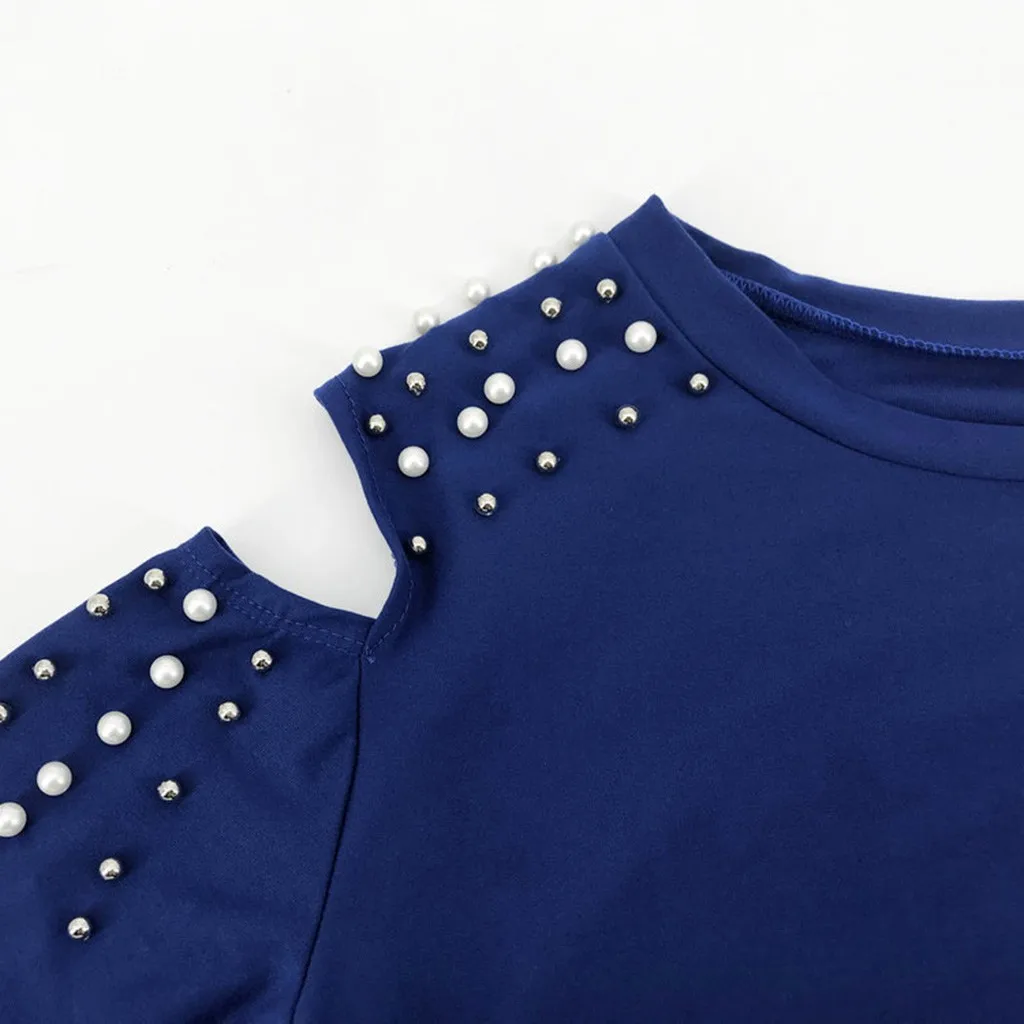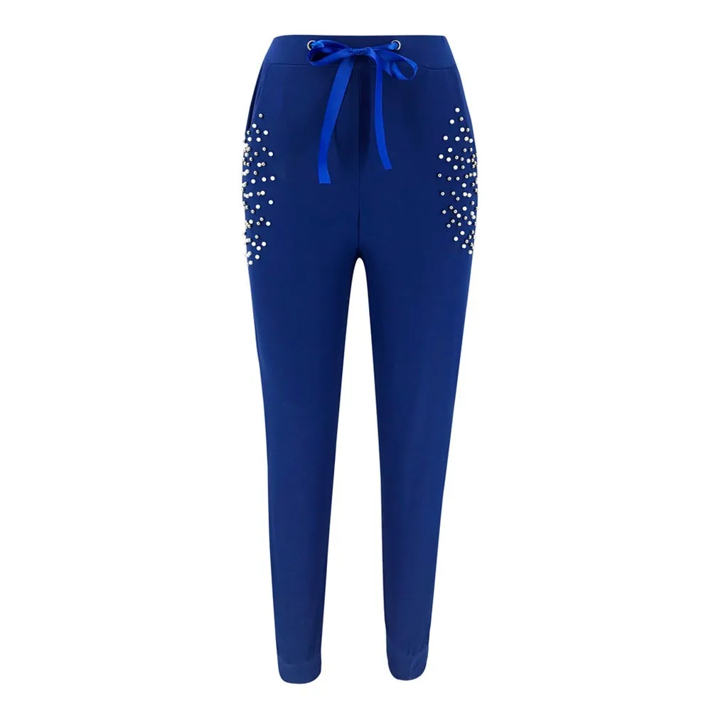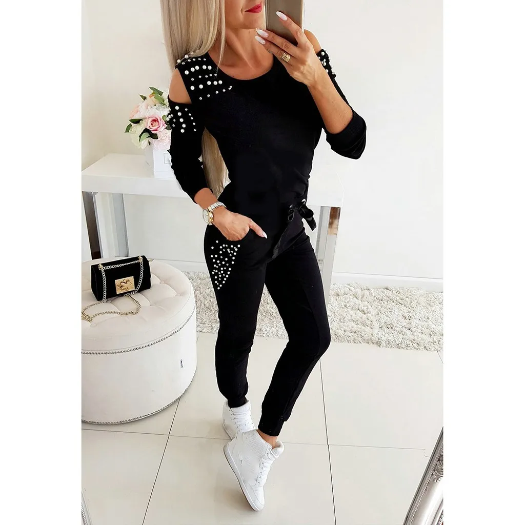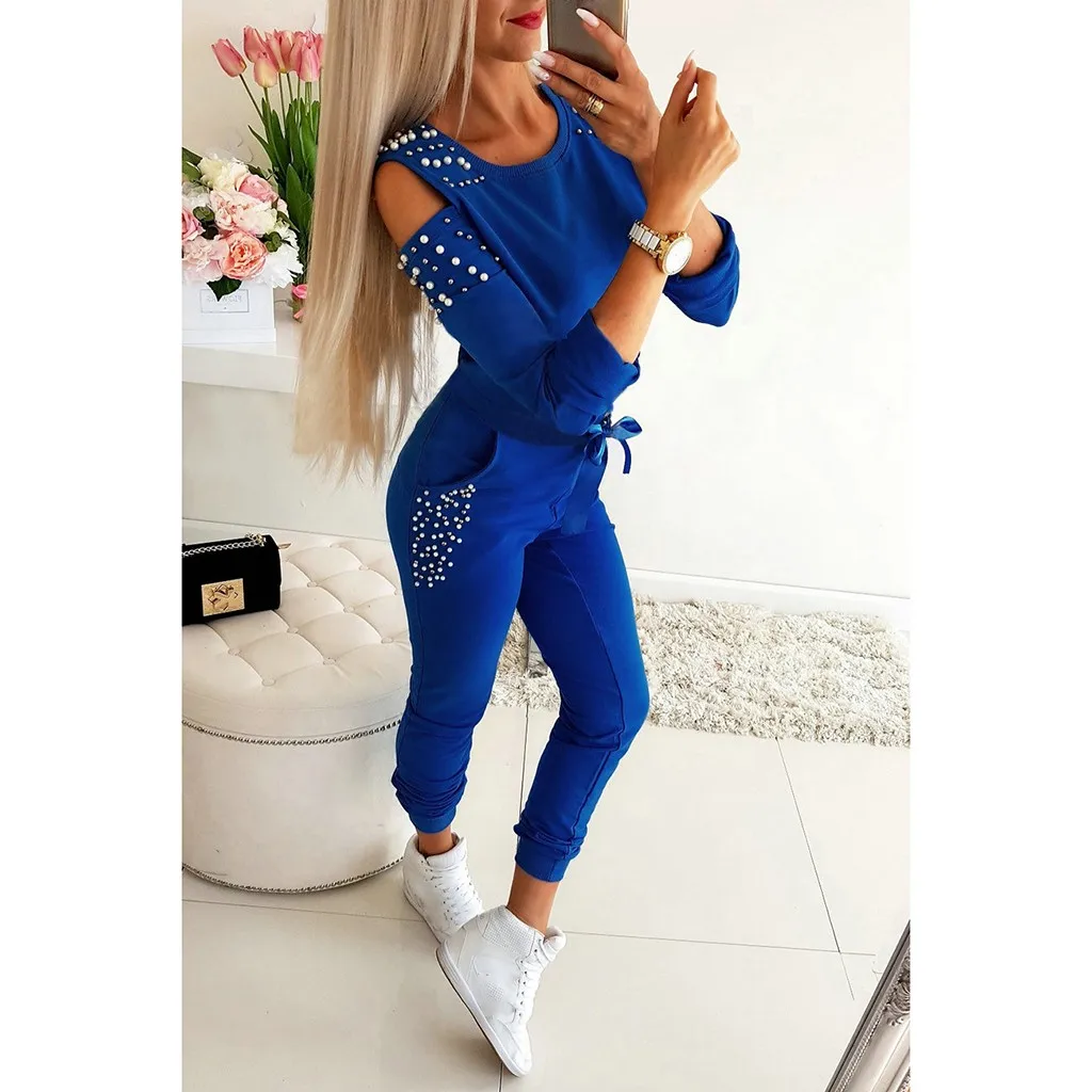 2Pcs/Set Women Solid Color Beading Sweatshirt and pant Tracksuit Sport Suit