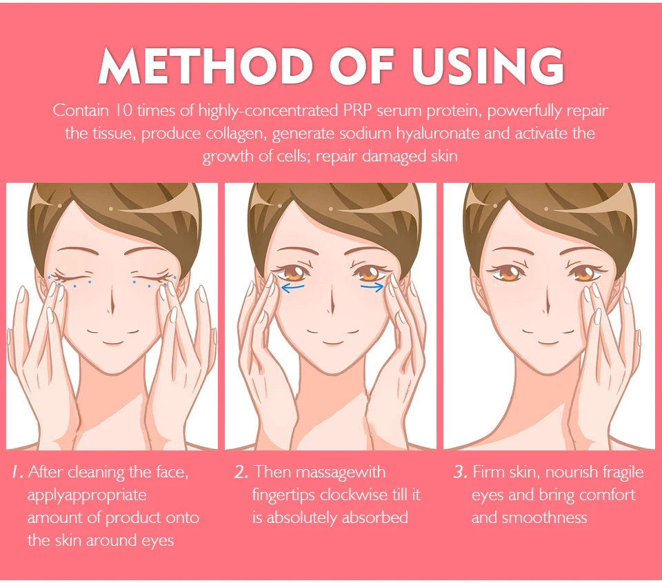 Contain I0 times of highly. concentrated PRP serum protein, powerfully repairthe tissue, produce collagen, generate sodium hyaluronate and activate the growth of cells; repair damaged skin 1. After dleaning the face, apply appropriate amount of product onto the skin around eyes 2. Then massagewith fingertips clockwise till it is absolutely absorbed 3. Firm skin, nourish fragile eyes and bring comfortand smoothness