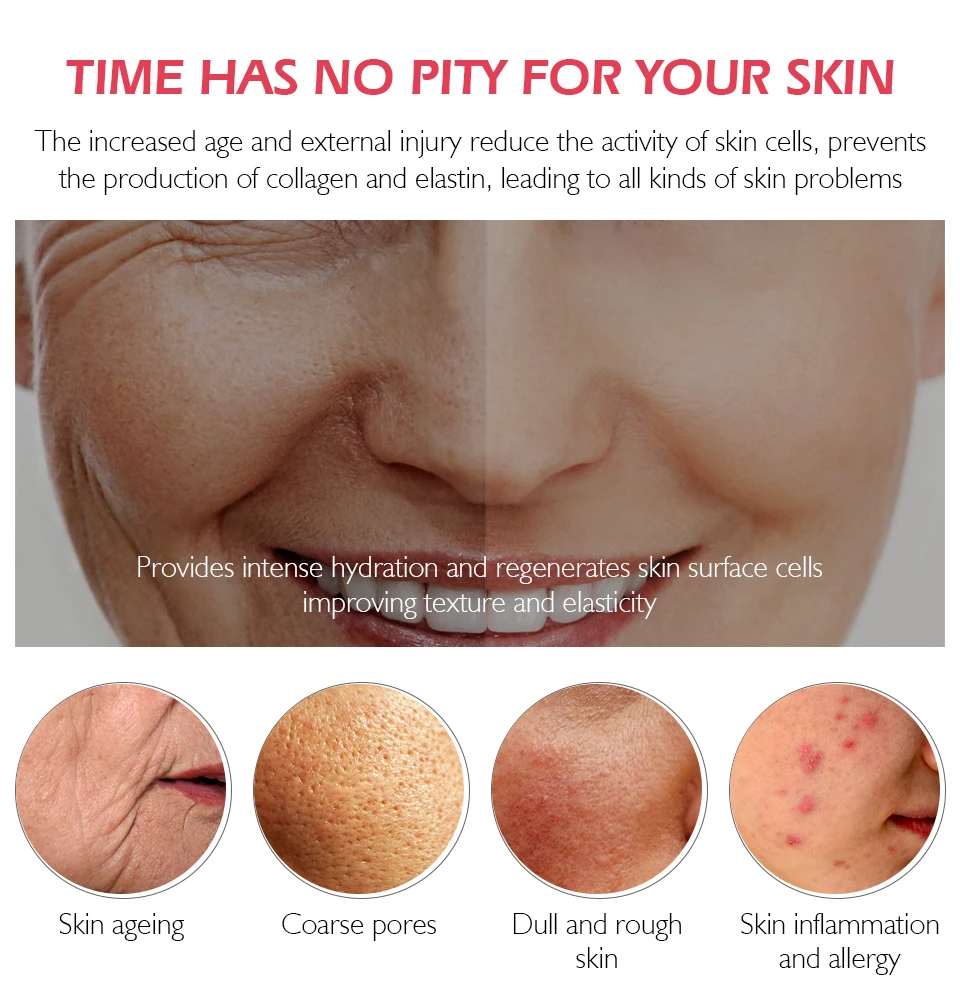 1. Stimulates collagen synthesis, smooths andcorrects the lok of fine lines and wrinkles 2. Increases the dermis thickness, deliver highest concentration of micronizedcollagen to skin's top layer to promotethe skin defense ability 3. Fades skin spots and provides a smoother, brighter complexion 4. Helps smooth, firm, and hydrate areas of your skin that can be proneto visible signs of skin aging 5. Reduces skin sensitivity and accelerates cell regeneration
