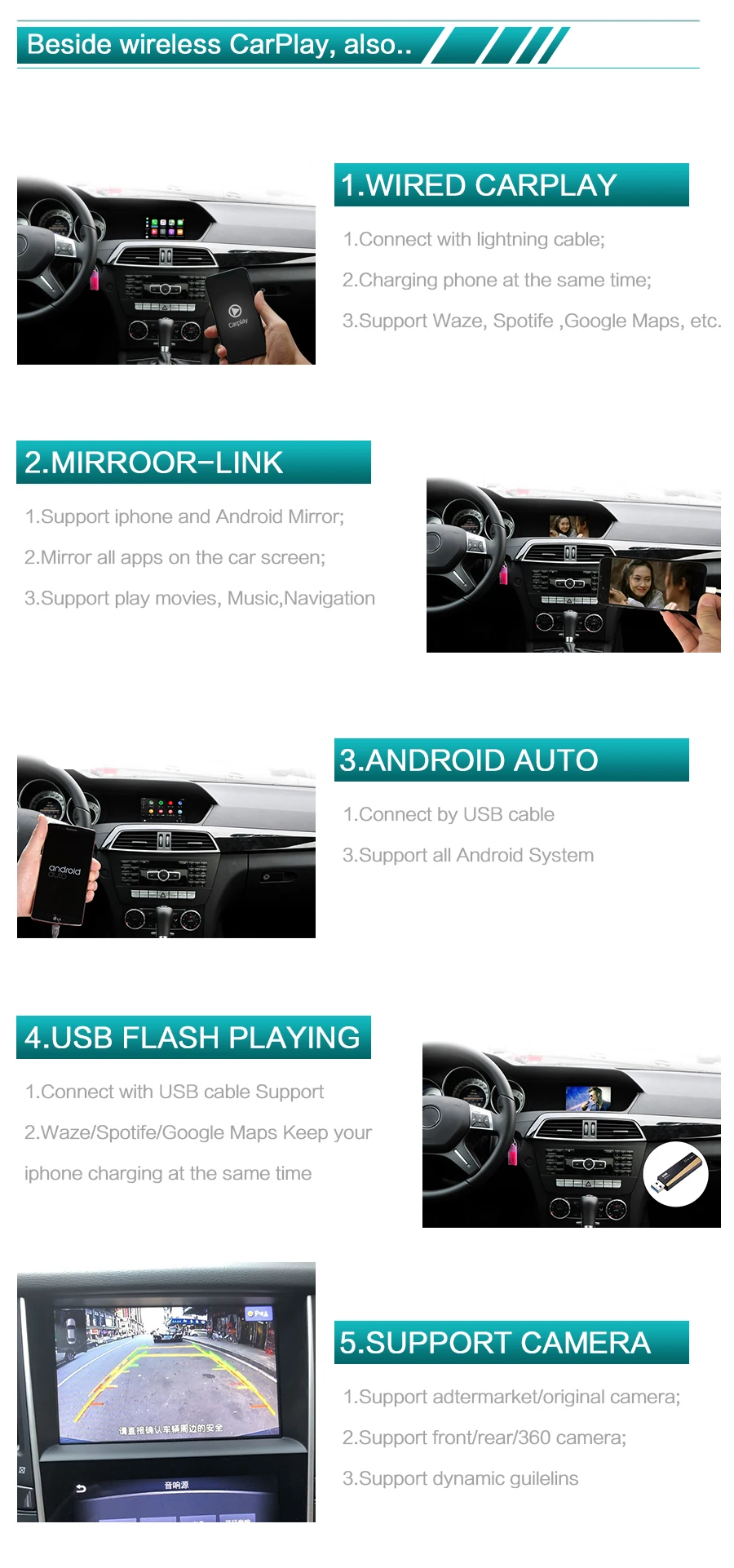 Поддерживаемые модели: A B C E GLK GLA ML SLK CLASS MODEL YEAR;2007-2011 преимущества продукта: 1. Неразрушающая установка, мы вышлем вам введение установки вместе с Carplay Box, plug and play 2. Когда автомобиль запустится, автоматически подключается для входа в CarPlay при запуске автомобиля, Автоматическое подключение для входа в Carplay 3. Когда вы совершаете и принимаете звонки, Используйте оригинальный автомобильный Bluetooth, качество звука идеальное: 1. Работает с беспроводным Apple CarPlay, сопряжение через Bluetooth, передача через WIFI. 2. Работает с проводным CarPlay также, сначала выключите wifi, подключите с помощью кабеля освещения (проводное Удерживайте телефон одновременно) 3. Android Mirroring-Link для телефонов Android (ссылка для скачивания) 4. GPS навигационные приложения, Google Maps, Waze и Apple Maps доступны, информация о живом движении 5. Музыкальные яблоки Spotify,Apple Music, Amazon и т. Д. Аудио через фабрику Audi media, текст на дисплее для некоторых приложений. 6. Голосовое управление, говоря "Эй Siri..." 7. Aftermarket фронтальный/задний/360 вход камеры. (Поддерживаются линии динамического наведения) 8. USB флэш-накопитель для воспроизведения музыки и видео с помощью подключения usb-порта от CarPlay kit 9. Регулировка эквалайзера. Лучшее качество звука. Выберите свой любимый стиль свободно (поп, рок, мягкий, стандартный ..) 10. Полное управление кнопками OEM. 11. Внимание: перед размещением заказа, пожалуйста, проверьте, активирован ли автомобильный AUX или если подлокотник имеет интерфейс AMI.