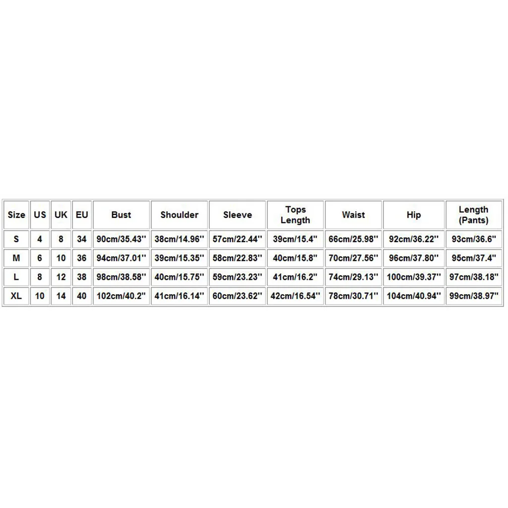 | Размер | США | Великобритания | ЕС | Бюст | Плечо | Рукав | Длина топа | Талия | Бедра | Длина (брюки) |