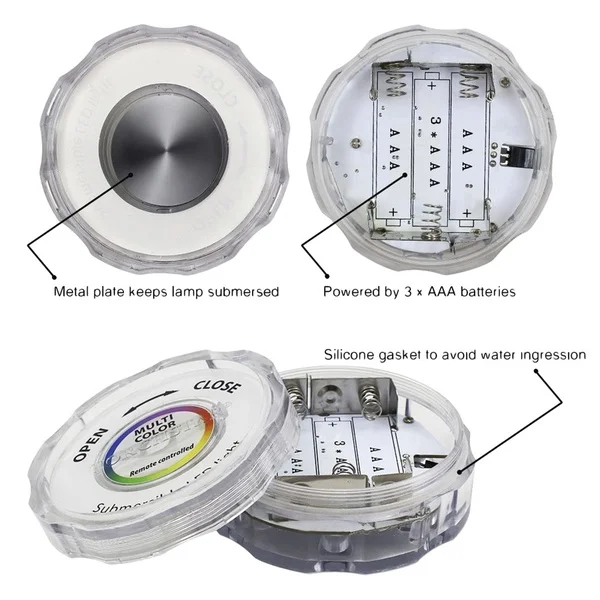 Особенные характеристики Многоразовые: работает от 3 батареек AAA, легко заменить, сэкономить деньги для вас Мульти Цвет: супер яркий 10 led Встроенный, 4 динамических режима изменения цвета, 16 различных цветов в статических режимах. Водонепроницаемый: светодиодный свет изготовлен из высококачественных двойных водонепроницаемых материалов, не беспокойтесь об этом при погружении в воду. Пульт дистанционного управления: беспроводной дизайн, ИК-пульт дистанционного управления, затемнение и ВКЛ/ВЫКЛ. Многоцелевой: отлично подходит для цветочных вазочек, бассейна, аквариума, свадьбы, Рождества, вечерние и другие мероприятия Обратите внимание: * Убедитесь, что закрутите колпачок по часовой стрелке правильно и плотно, прежде чем бросать его в воду. * Когда батарея разрядится, свет застревает в красном цвете, если больше не переключается между цветами и Удаленная остановка работы, то, пожалуйста, замените батарею. * Максимальная глубина для достижения рекомендуется быть менее 2 м. Технические характеристики: Мощность: 2,4 Вт за штуку Светильник Цвет: разноцветный "Красный-зелёный-желтый Источник питания: 3 * AAA батареи на штуку (не предоставляются) Светодиодный Кол-во: 10 светодиодный бусины за штуку Степень защиты: IP67 Вес изделия: 60 г за штуку Размер товара: 7*7*2,8 см/2,75*2,75 * 1.10in (Д * Ш * В) за штуку Вес посылка: 300 г/10,56 унций Посылка: 19,7*18*5 см/7,75*7,08 * 1.96in (Д * Ш * В)