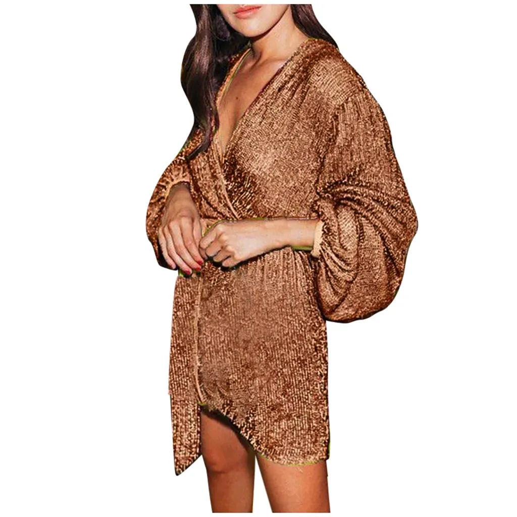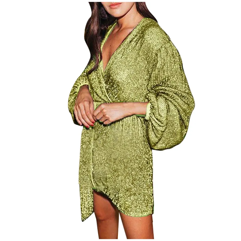 Женское сексуальное тонкое однотонное мини-платье с v-образным вырезом и длинным рукавом