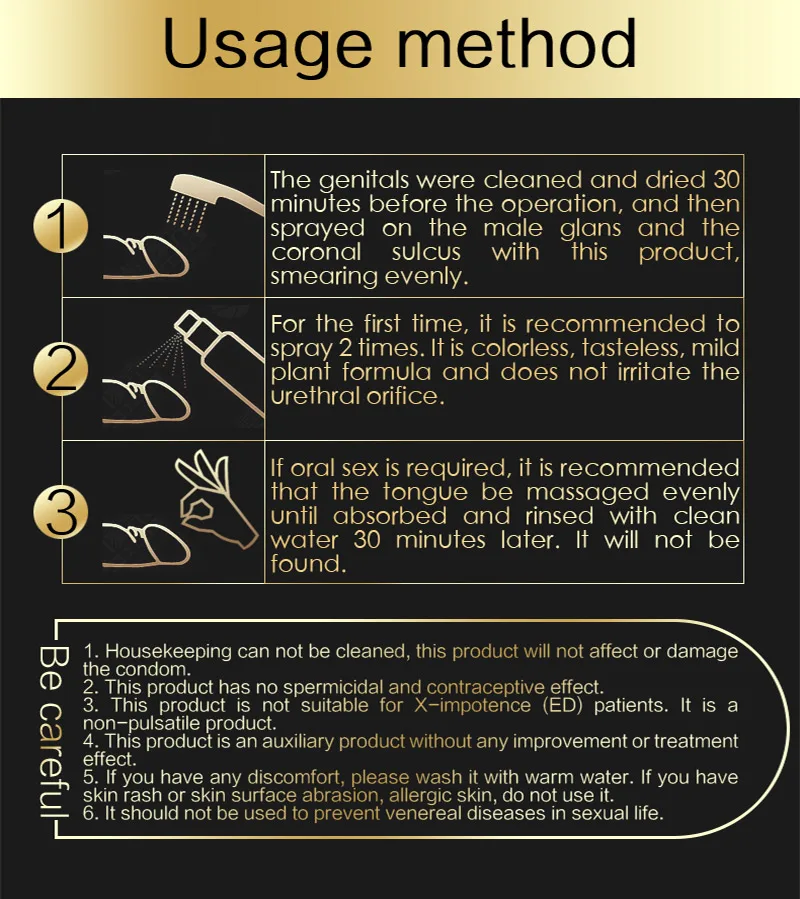Распылите пенис и коронарный сулькус этим продуктом за 30 минут до полового акта и равномерно нанесите. Этот продукт эффективен около 60 минут
