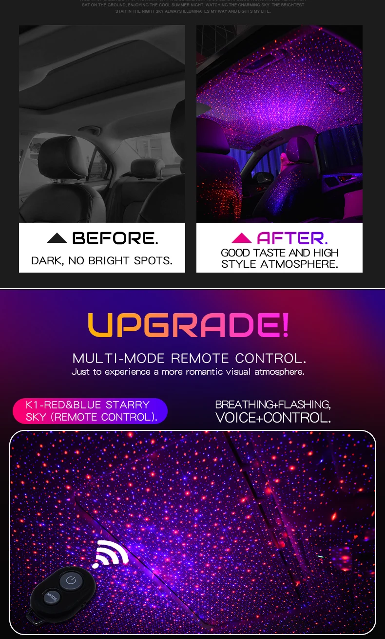 1. Режим сцинтилляции: звездный свет медленное мигание, взрывоопасный мигающий перекрестный режим после запуска 2. Режим голосового управления: когда есть музыка, звездный свет будет мерцать с ритмом и интенсивностью музыки, и когда нет музыки, звездный свет не будет turm on 3. Режим дыхания: звездный свет будет продолжать выцветать, формируя эффект сцинтилляции дыхания.