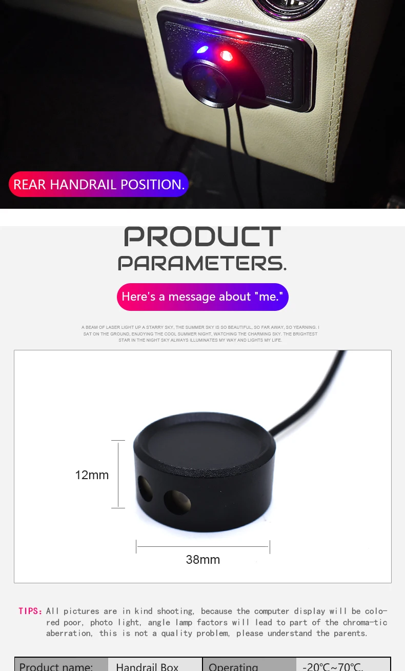 Название продукта: Коробка Starlight Тип продукта: K1 Вес изделия: 0,3 кг Размер продукта: 12*38 мм Рабочее напряжение: 5 В Рабочая температура:-20 ° ℃-70 ℃ Мощность лазера: Red100mw green30mw blue80mw Срок службы продукта: более 10000 часов Водонепроницаемый скорость передачи данных: IPX4 Длина волны лазера: Red650nm green30nm blue80nm Расположение: хвостовое положение подлокотника Линия подключения: достаточно USB гнезда Примечание: 1. Различия из-за освещения и дисплея, цвет изделия может немного отличаться от изображения. 2. Замеры сделаны вручную, поэтому возможны отклонения на 0,1-0,2 см.