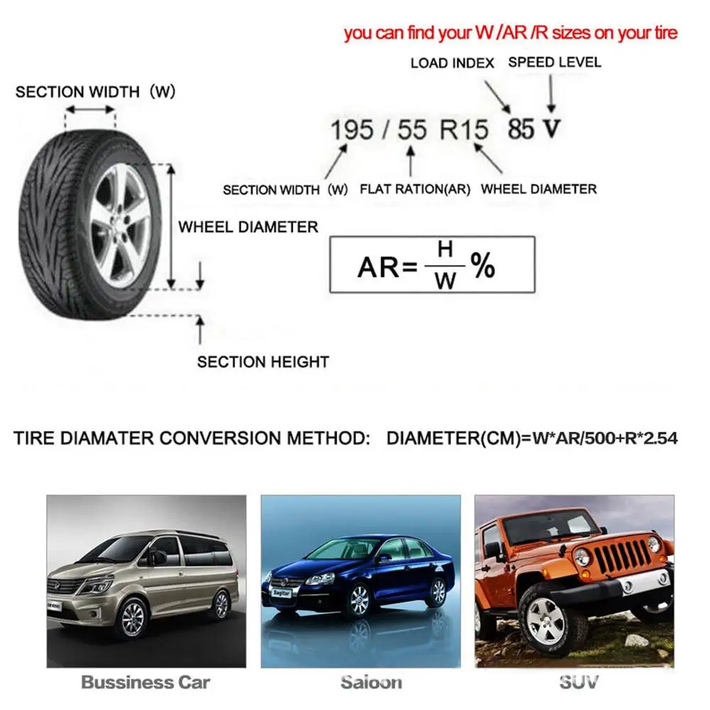 Ниже приводится информация о том, подходит ли этот чехол для шин для вашей шины. Например, если ваша шина 195/55R15 85V (A = 195 B = 55 C = 15), вашу шину диаметр = A * B/500 + C * 2,54 = 195*55/500 + 15*2,54 = 59,55 см, таким образом, вы можете выбрать размерную сетку 65-68 см.