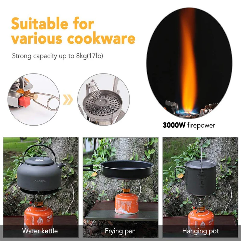VПростота в использовании: Может использоваться непосредственно на универсальных газовых баках с круглым винтовым креплением. Прикрутите плиту к топливному контейнеру, а затем вы можете нагревать кастрюлю.