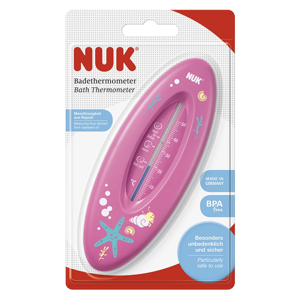 Nuk bath thermometer is filled with pure rapeseed oil-a natural product that will not do any harm even if it is for any reason poured out. Made of unbreakable remaining material shape. The thermometer has funny drawings.