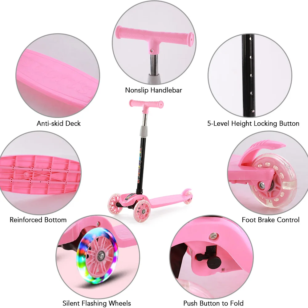 Скутер имеет регулируемую высоту, Управление тормозом ног, нескользящий руль и палубу, а также мигающие колеса PU, предлагая