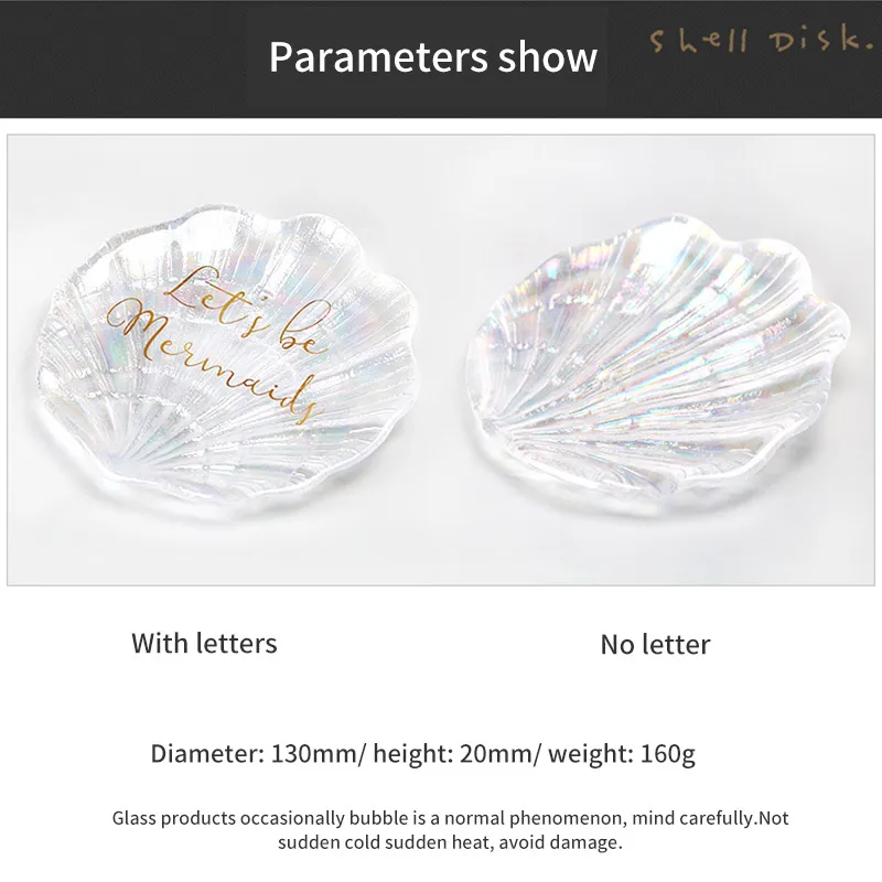 Shell shape and colorfulMade from high quality lead-free glass, featuring shell shape plate dish, this colorful shell shape plate is very gorgeous and attractive, it shown different colors under lights.