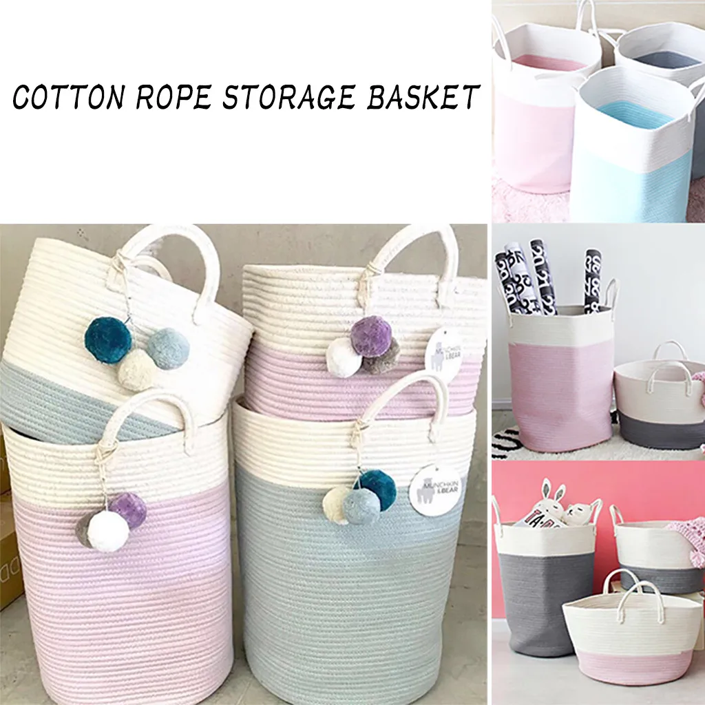 - 【Простой дизайн 】 плетеная корзина для хранения дизайн показан тело с двумя прозрачными цветами и модной ручкой с узлом. Прочная хлопковая тканая веревка обеспечивает хорошую производительность. Он может закончить работу в спальнях, игровых комнатах и детских садах, играя декоративную роль.