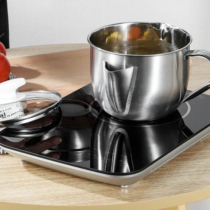 4. Двухсторонний выход, верхнее отверстие для высыпающего супа с маслом, нижнее отверстие высыпает суп без масла.