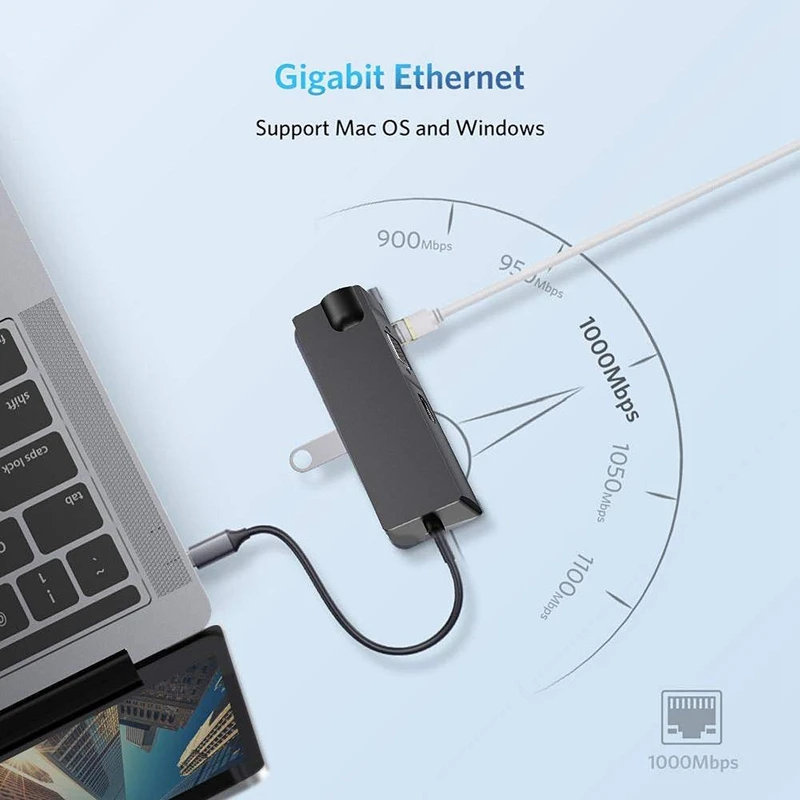 2. Передача данных за считанные секунды-Док-станция USB C поддерживает гигабитный Ethernet порт, обратная совместимость со 100 Мбит/с/10 Мбит/с RJ45 LAN. Порт Gigabit Ethernet обеспечивает более стабильное и быстрое проводное подключение к сети.