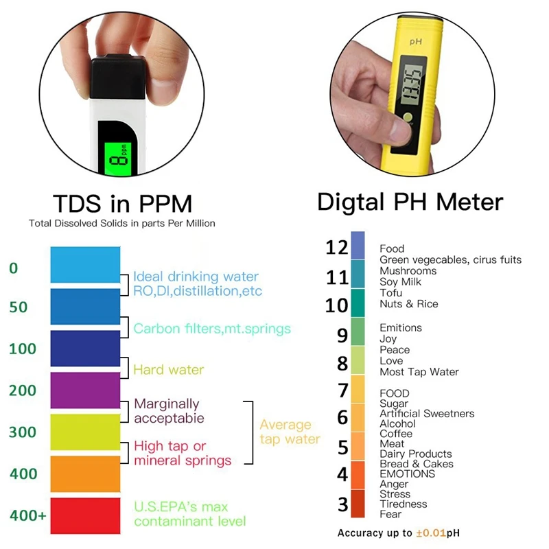 Широкое применение: идеально подходит для фильтров для воды, пищевых продуктов (овощей, фруктов) и контроля качества напитков, применения для тестирования pH и TDS, таких как аквариумы, бассейны, питьевая вода и т. д.