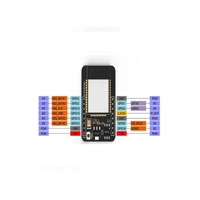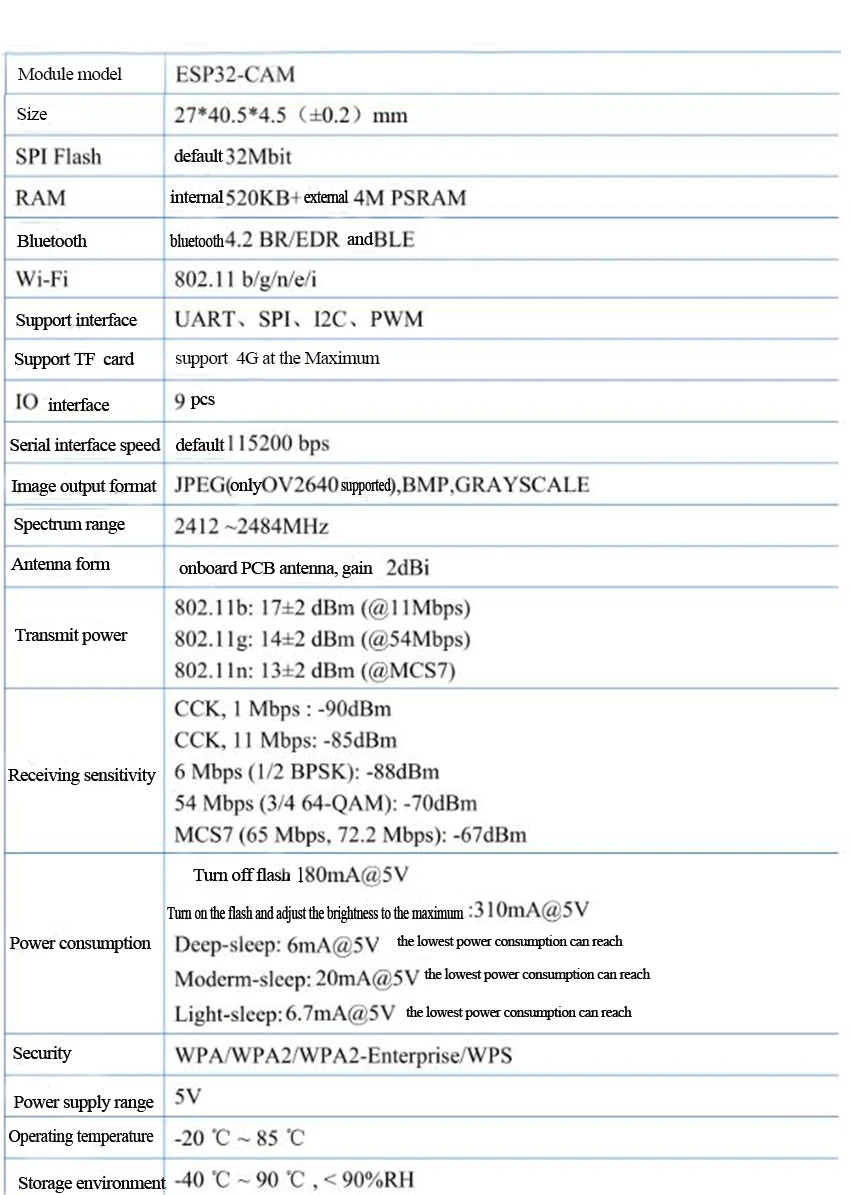 Low-power dual-core 32-bit CPU, can be used as application processor,Main frequency up to 240MHz, computing power up to 600 DMIPS,Built-in 520 KB SRAM, external 4M PSRAM. Supports UART / SPI / I2C / PWM / ADC / DAC and other interfaces,Supports OV2640 and OV7670 cameras, built-in flash,Support picture WiFi upload,Support TF card,Supports multiple sleep modes,Built-in Lwip and FreeRTOS,Support STA / AP / STA + AP working mode,Support Smart Config / AirKiss,Support secondary development. Notice:1. Please ensure that the input power of the module is at least 5V 2A, otherwise there will be a chance of water ripples in the picture.2.ESP32 GPIO32 pin controls camera power. When the camera is working, please pull GPIO32 low.3. Because IO0 is connected to the camera XCLK, please leave IO0 unconnected when using, do not connect high or low level.4. The default firmware is included in the factory. It is not provided for download. If you need to re-burn other firmware, please proceed with caution. Application areas:Home smart device image transmission,Wireless monitoring,Smart agriculture,QR wireless identification.Package includes: 1pc ESP32-CAM OV2640 Camera Module Board